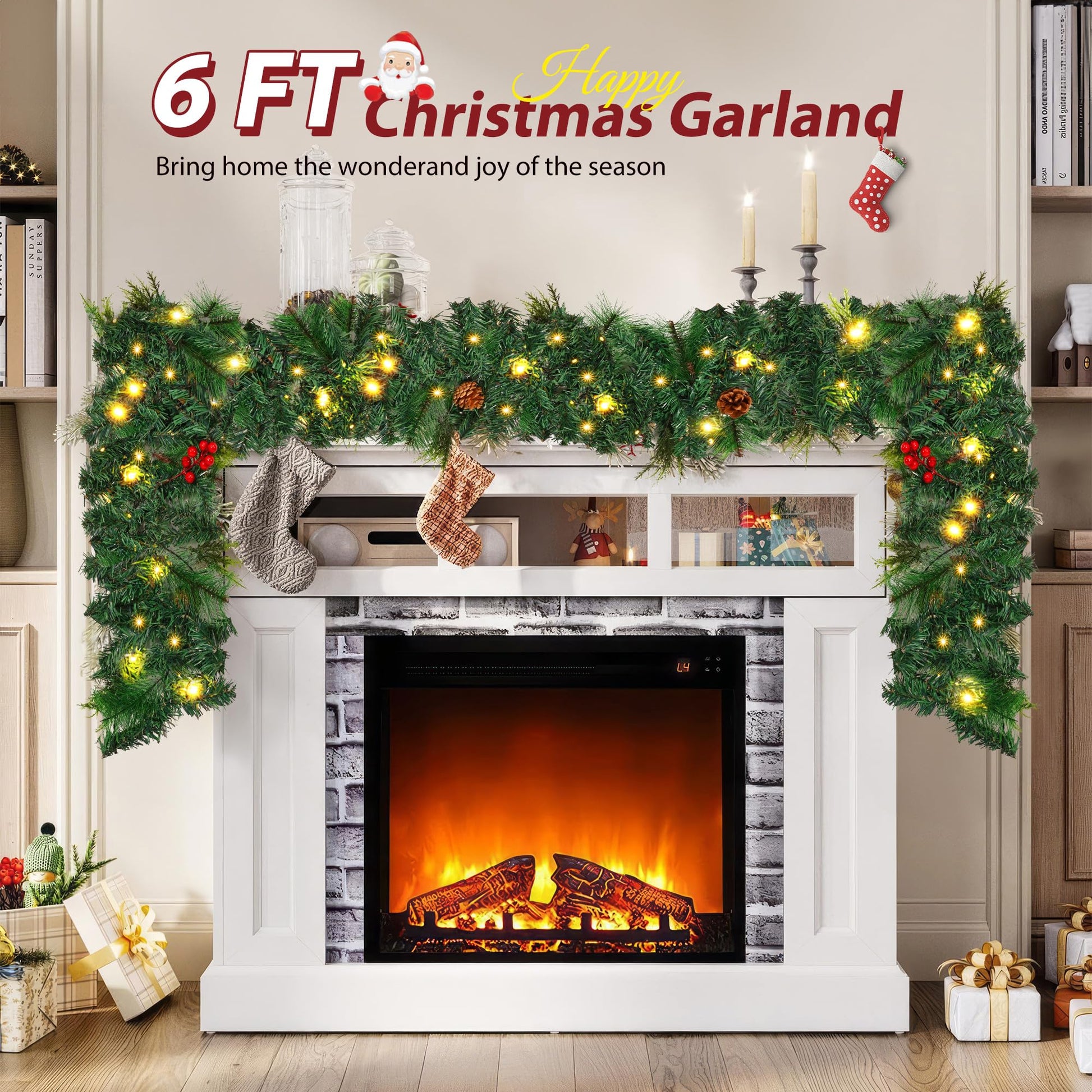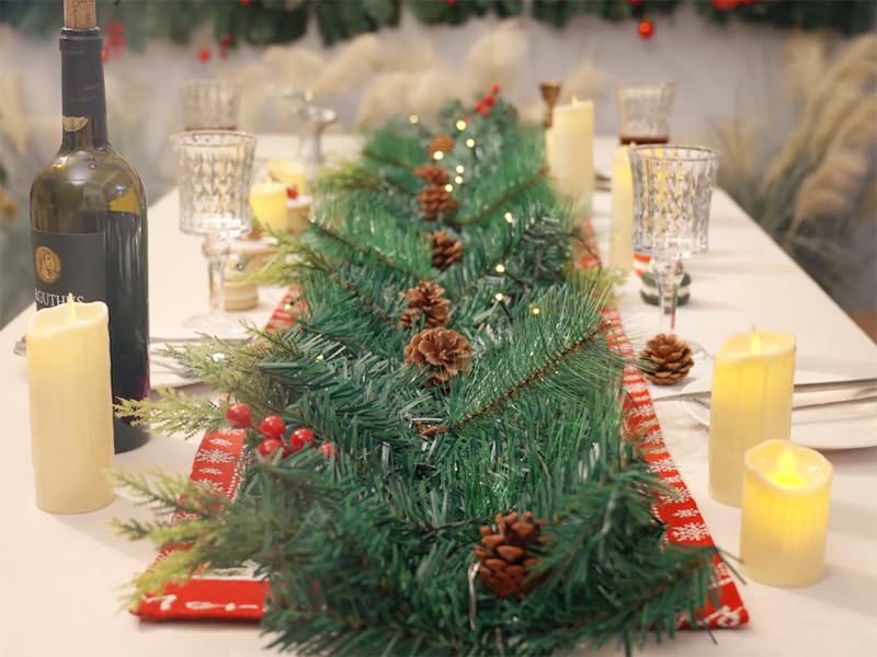 - Built-in 50 LED Lights: The Xmas Garland pre-lit with 50 LED warm white lights among the branches create a glowing nighttime display. Illuminate your home or yard for maximum joy all shine to create a festive and enjoyable Christmas atmosphere. Needs 3 AA batteries (not included) to ensure sustained brightness
