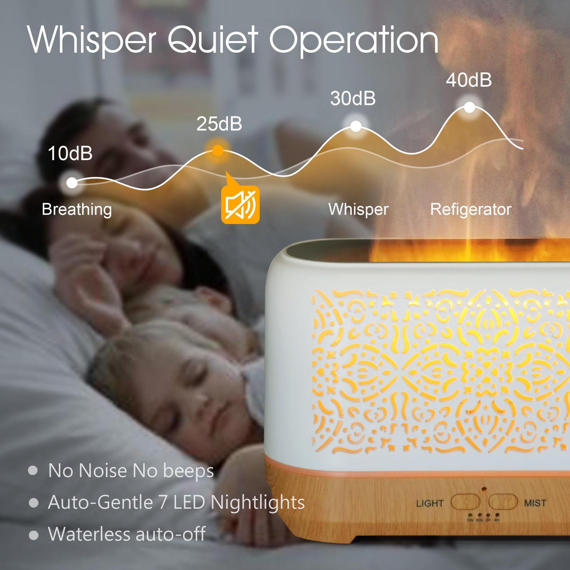 - Essential Oil Diffuser with Flame Night Light is the perfect match. It’s a great companion for you to focus, study, yoga or sleep.