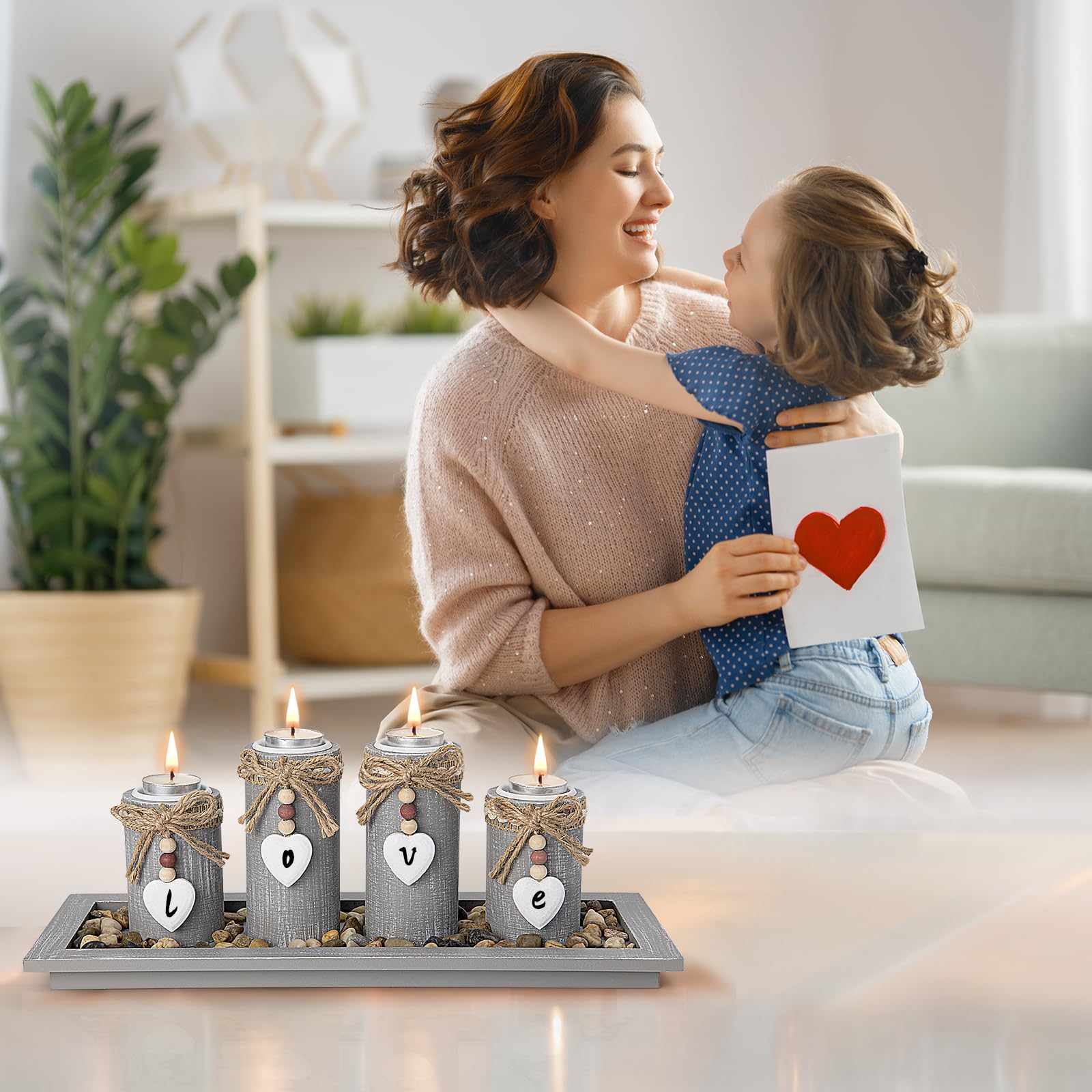 - PRODUCT DETAILS - The product is a set of 4 gray candle holders, perfect for adding a serene touch to any room. With heights of 9/12 cm and a stable base of 6 cm, these holders are designed for candles with a height of 1.4 cm and a diameter of 3.9 cm. The decorative tray base measures 14 / 2.5 / 38 cm, and the total weight is 1100 grams. The set also includes a bag of decorative stones, making it an ideal Mother's Day gift to show your appreciation and love. Tip: The candle holders set does not contain candles