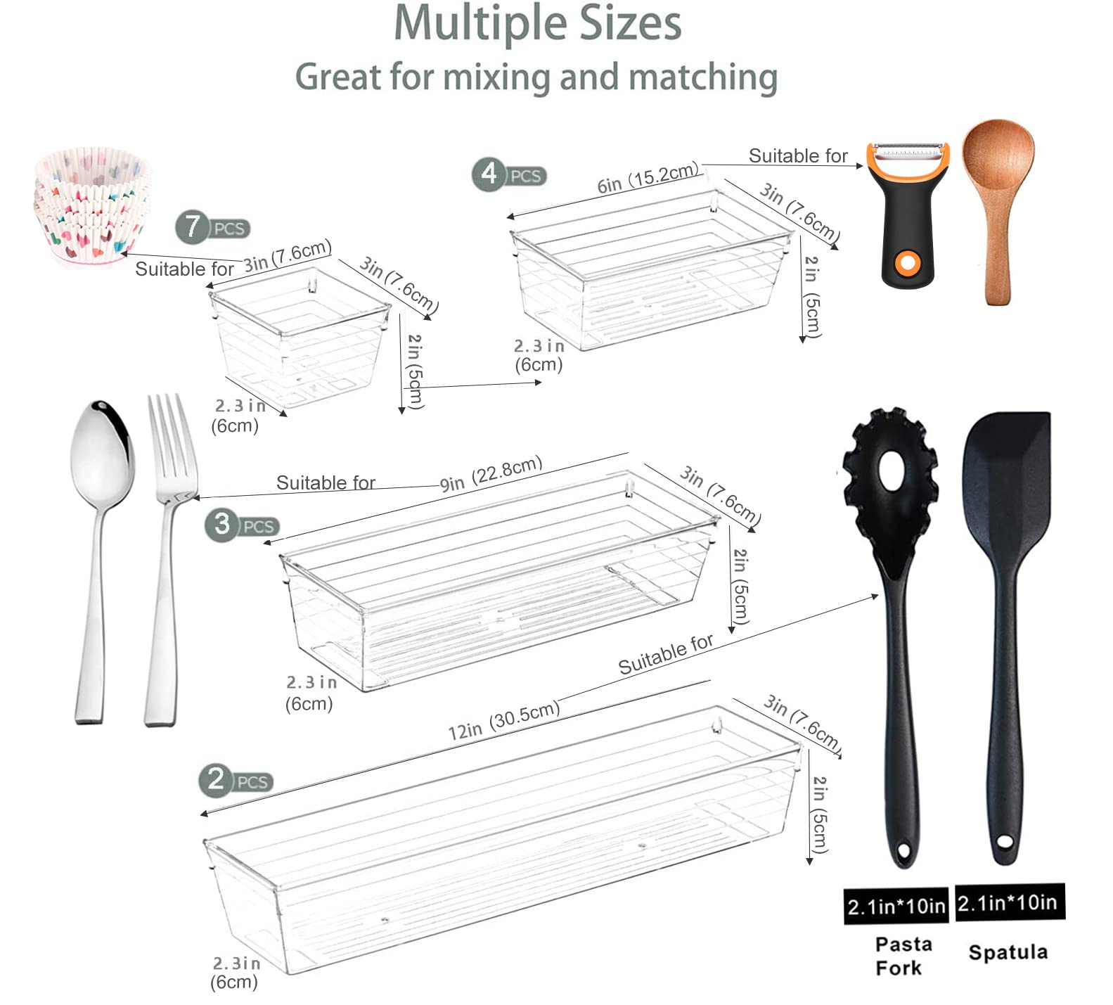 - CUSTOMIZE LAYOUT:These clear drawer organiser tray can be arranged any way you want because of variations in size, DIY your own drawer organizers. The freely divided layout can not only divide and organize the clutter clearly, but also save you time in searching