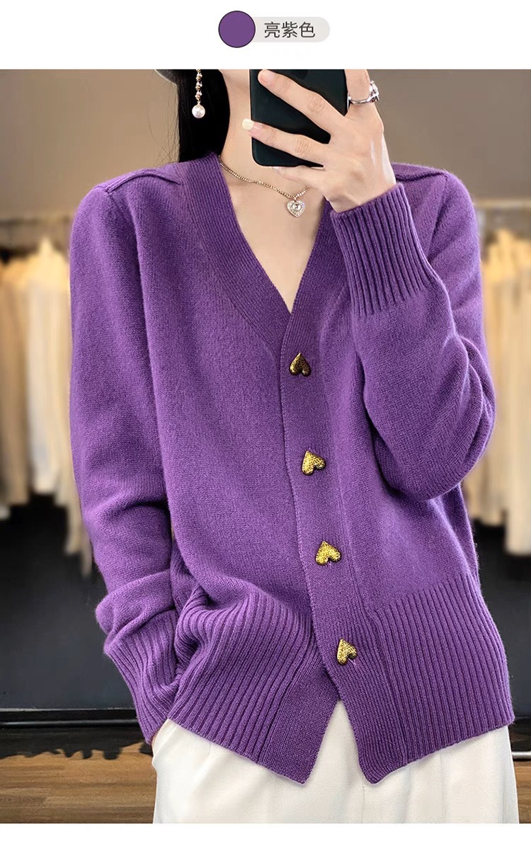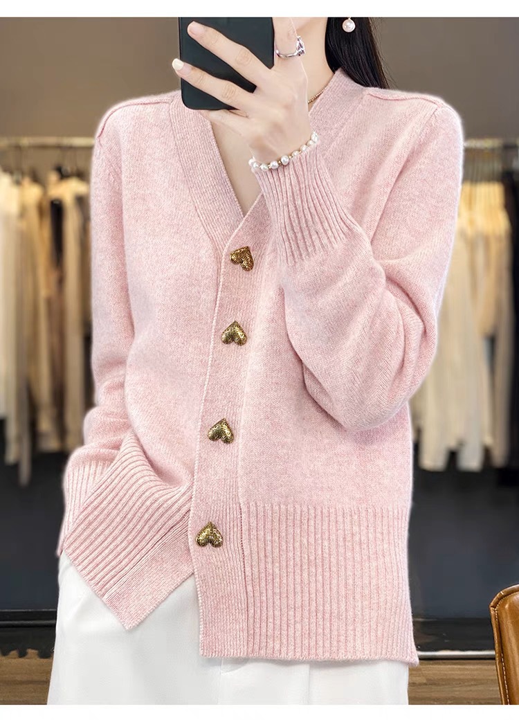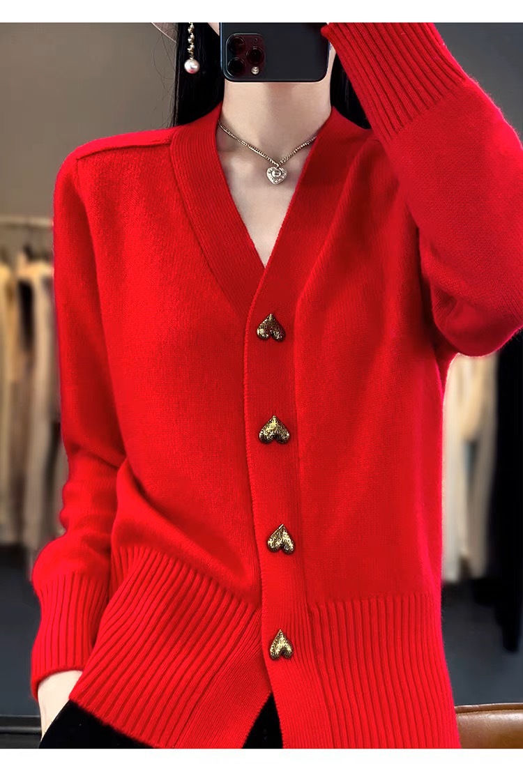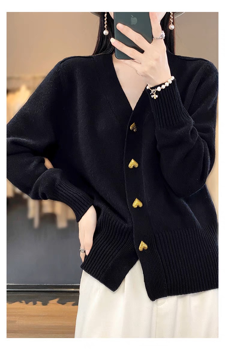 Heart Buckle Solid Color Knitted V-neck Cardigan Loose Sweater For Women