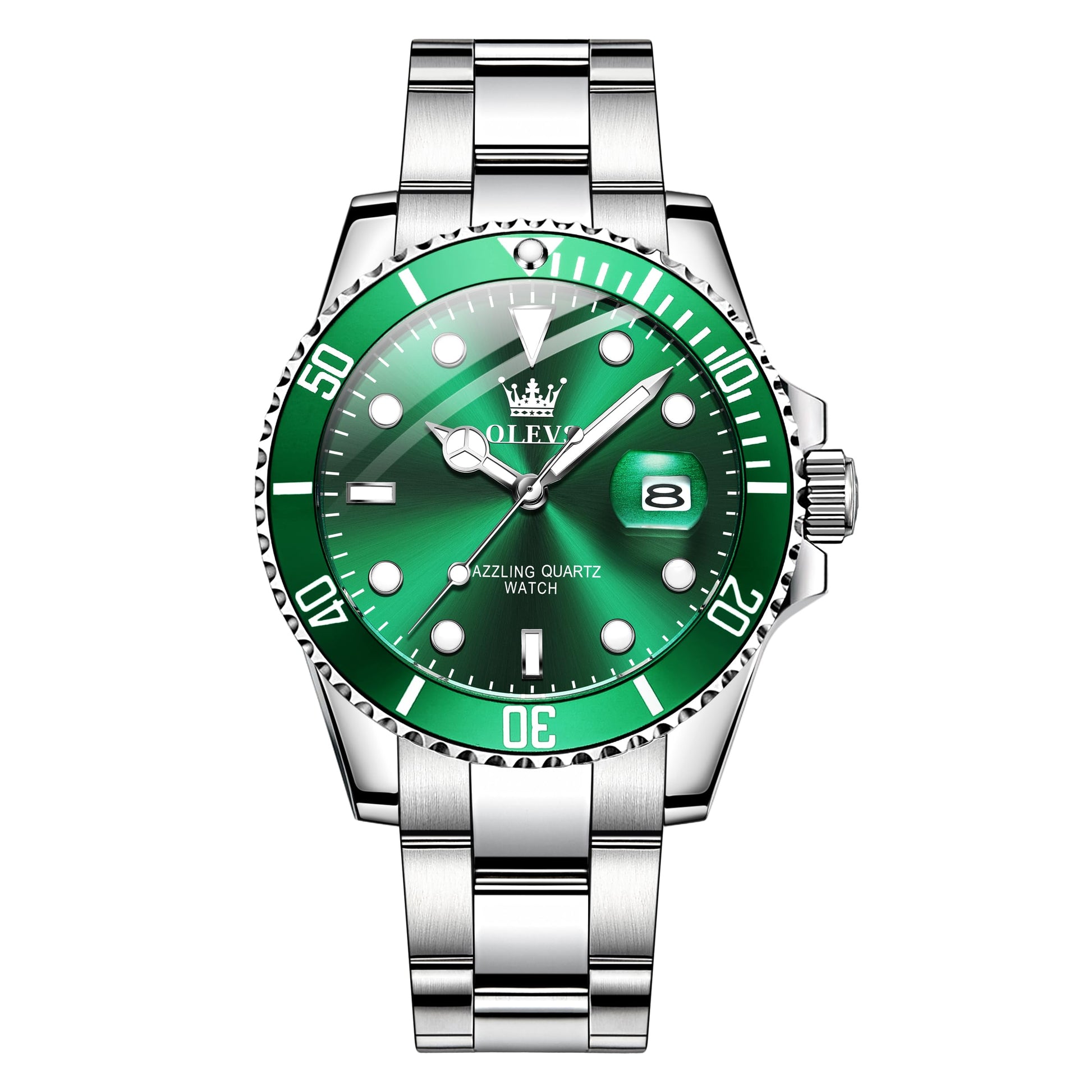 OLEVS Mens Watch Big Face Silver Stainless Steel Analogue Quartz Watches Men Green Dial Rotatable Bezel Calendar Men's Dress Watch Waterproof Luminous with Date Watches for Men Reloj para Hombre