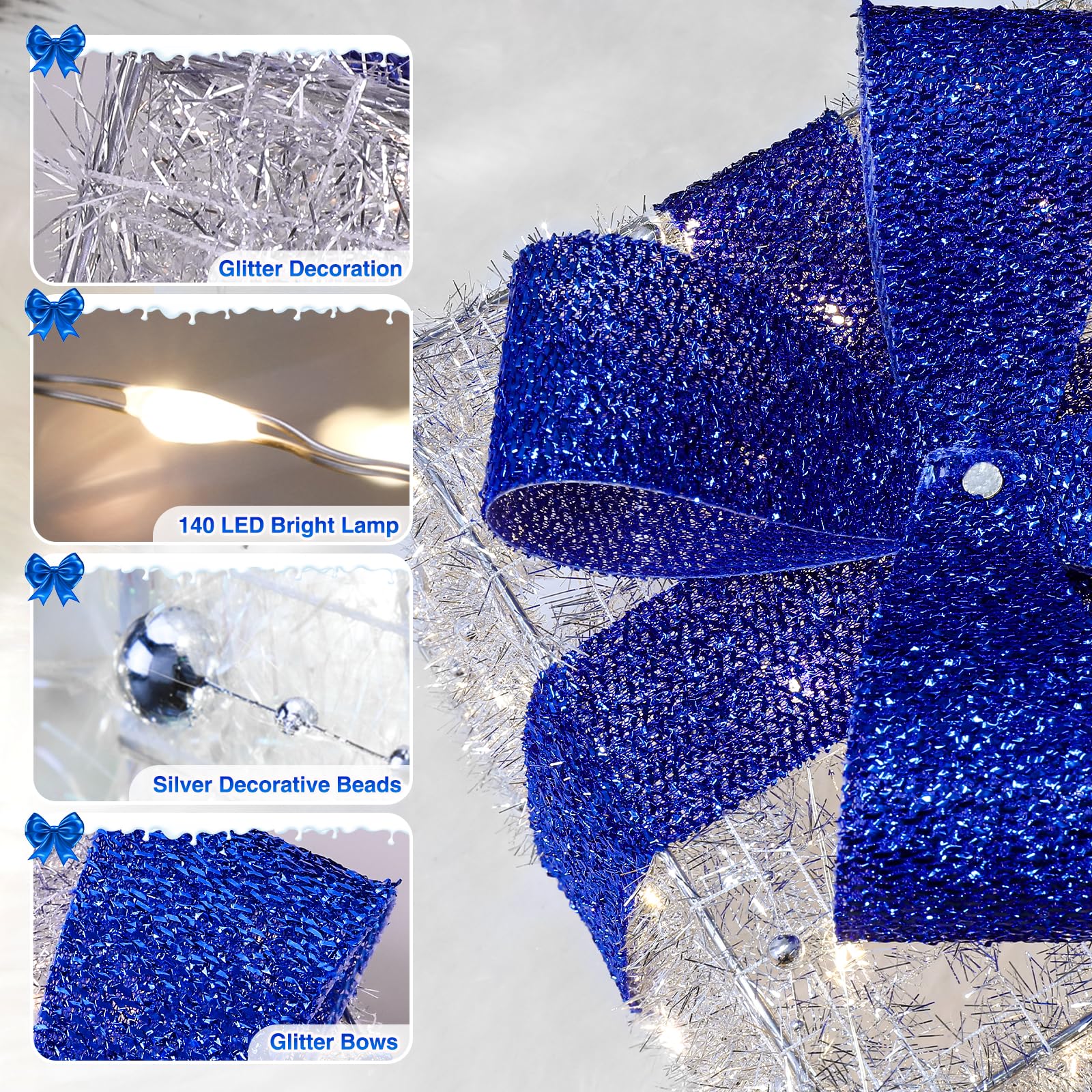 - Glittering Christmas Gift Boxes - Quntis Set of 3 different sized light up present boxes are designed with a metal frame, covered with shiny silver ribbon and silver beads and topped with a removable blue bow. The 140 super bright SMT LEDs shine brightly at night, lighting up the Christmas gift box, adding a fairytale atmosphere and accompanying you to spend a warm and happy Christmas.