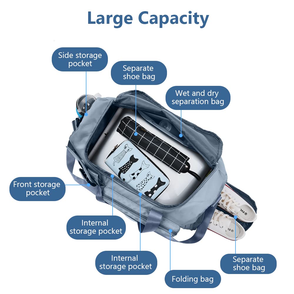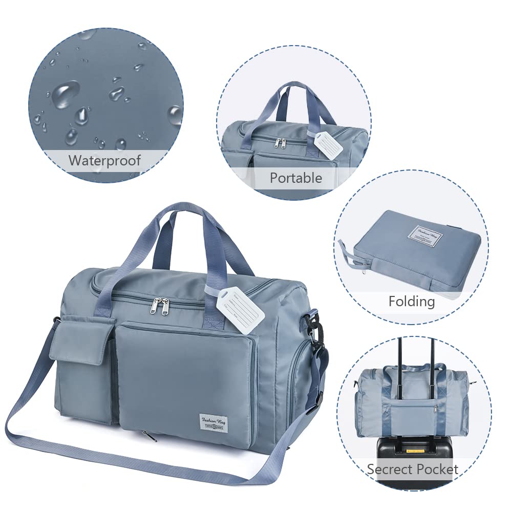 Travel Duffel, Foldable Gym Overnight Weekend Bags for Women - Lightweight with Separation, Large Holdall Cabin Bag - Blue