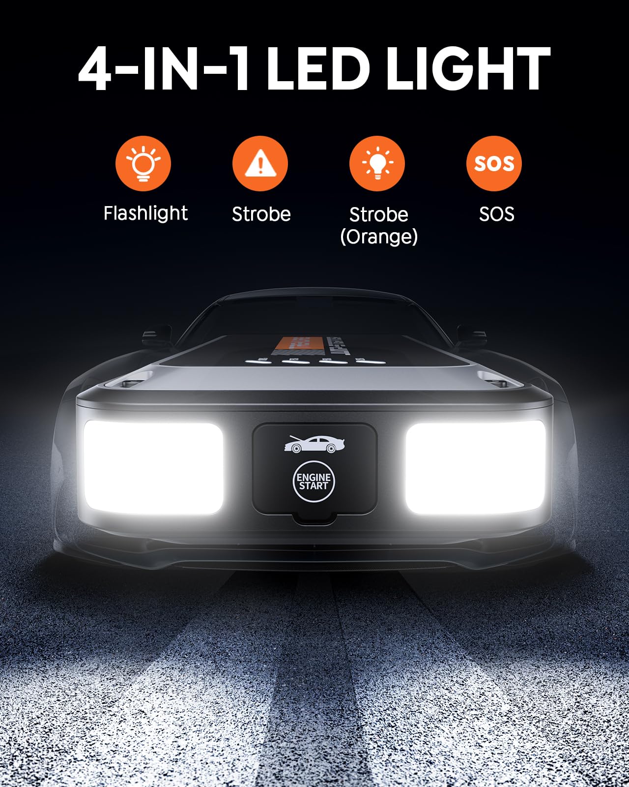 - 【4-Mode 300LM LED Flashlight – Be Ready for Any Emergency】 Equipped with a 300-lumen super-bright LED flashlight, this car battery booster jump starter features four essential modes: Steady Light for illuminating dark areas during repairs or camping, White Strobe to increase visibility and attract attention in low-light conditions, Orange Flashing (Warning Mode) to act as a visible roadside warning light during breakdowns, and SOS Mode as a critical rescue signal in distress situations.